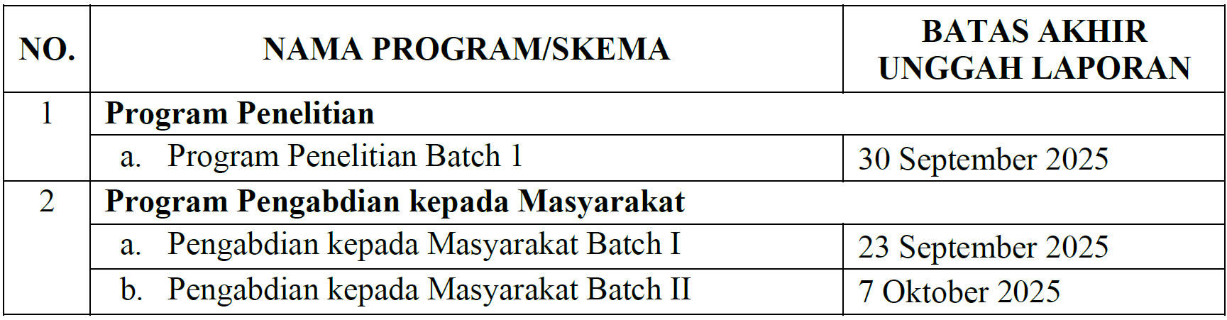 Menindaklanjuti Surat Direktur Penelitian dan Pengabdian kepada Masyarakat (DPPM) nomor 0913/C3/DT.05.00/2025 tanggal 5 September 2024 tentang Pemberitahuan Batas Waktu Pengunggahan Laporan Kemajuan Penelitian dan Pengabdian kepada Masyarakat bersama ini kami sampaikan batas akhir kewajiban mengunggah laporan kemajuan adalah sebagai berikut: